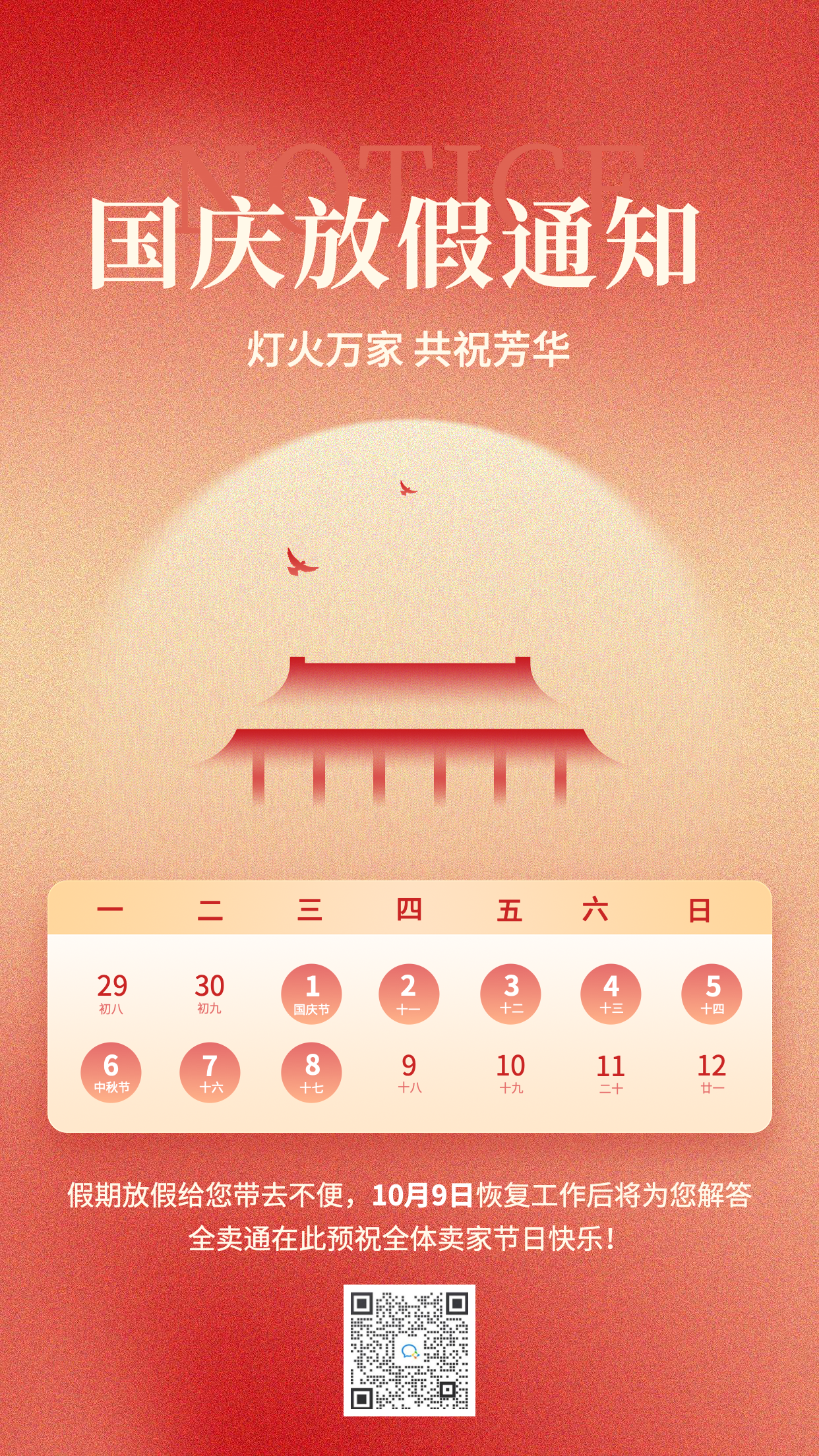 您好!国庆、中秋双节将至,根据《国务院办公厅关于2025年法定节假日放假安排的通知》,现将全卖通假期放假安排如下: